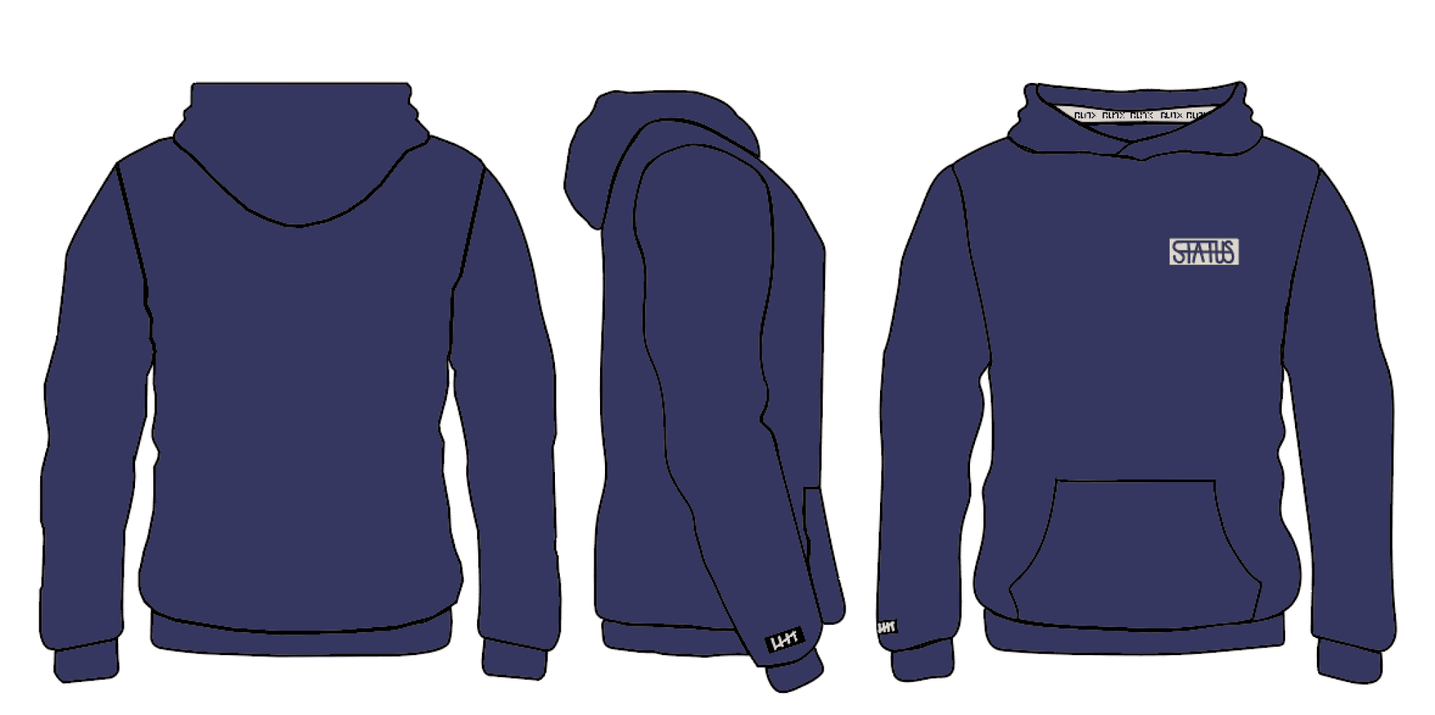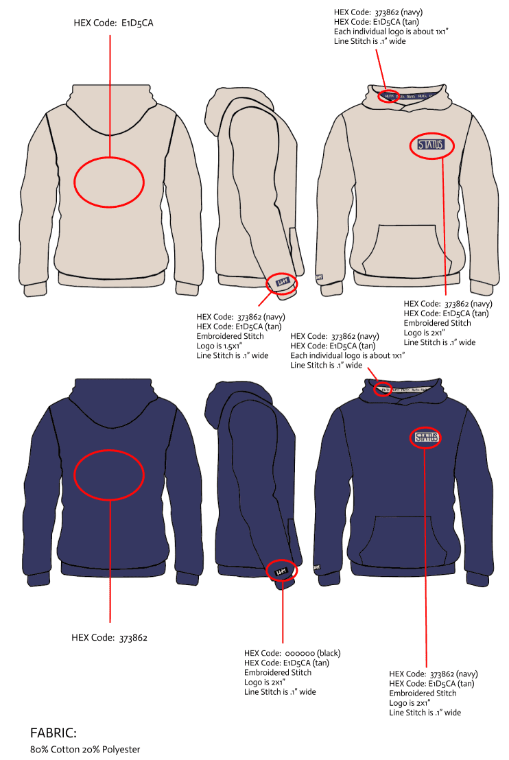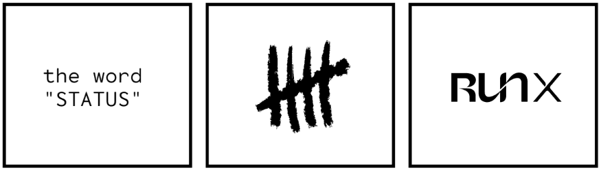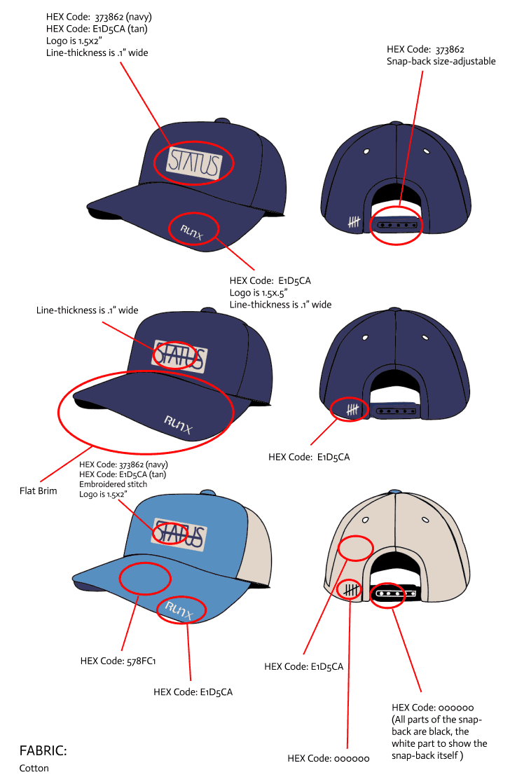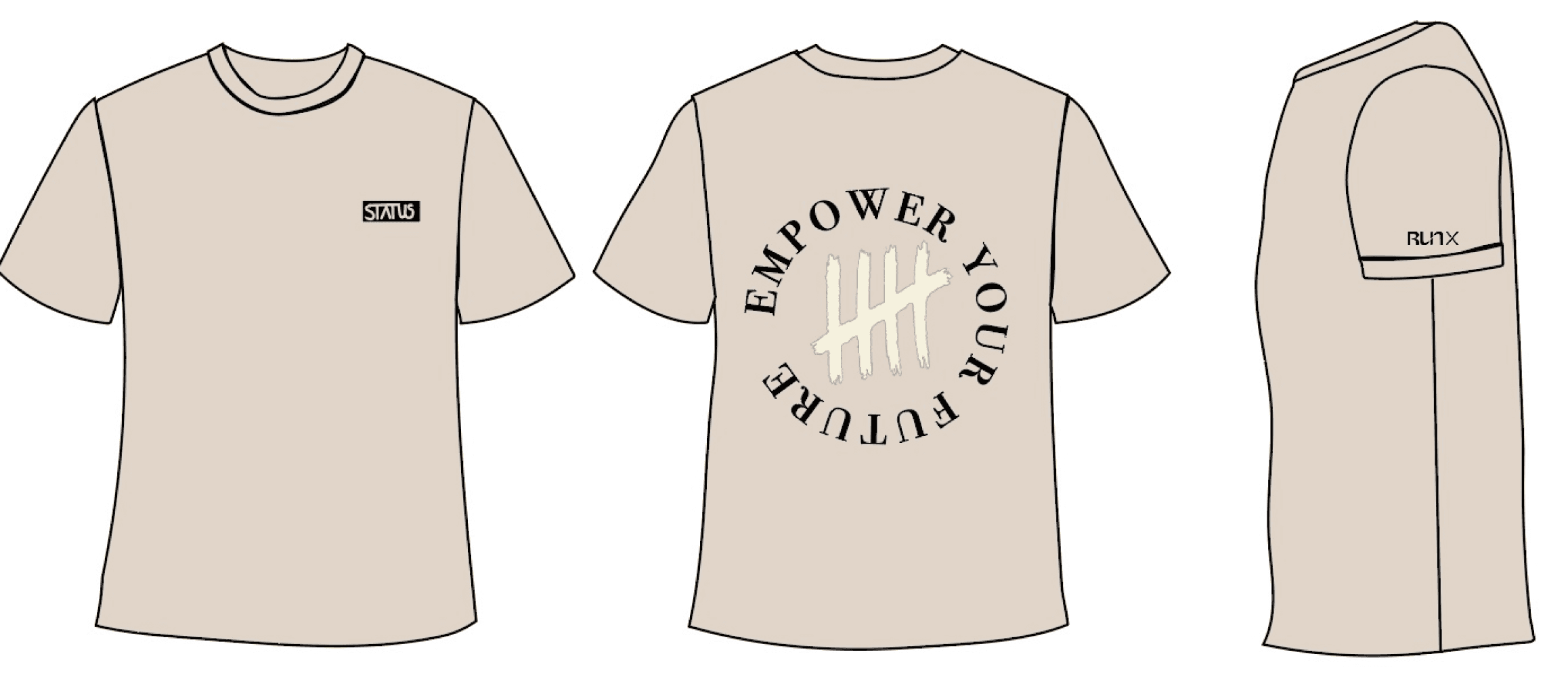 The next goal was to utilize two different logos and the word “status” in each of the clothing items. Below are the custom logos I made while incorporating the three requirements: the word “status”, the tally brand mark, and the “RunX” logo.