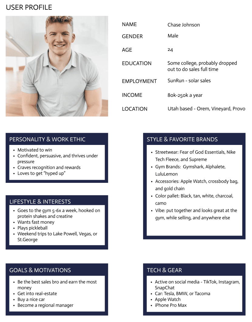 To start off this project, I knew I had to come up with a brand persona. Who would wear these clothes? Would they be proud to wear the clothes or would they sit in the back of their closet? I wanted to make sure I understood who I was designing for before I started the design process. To the right, you can see my brand persona and who I thought would ideally wear these clothes.