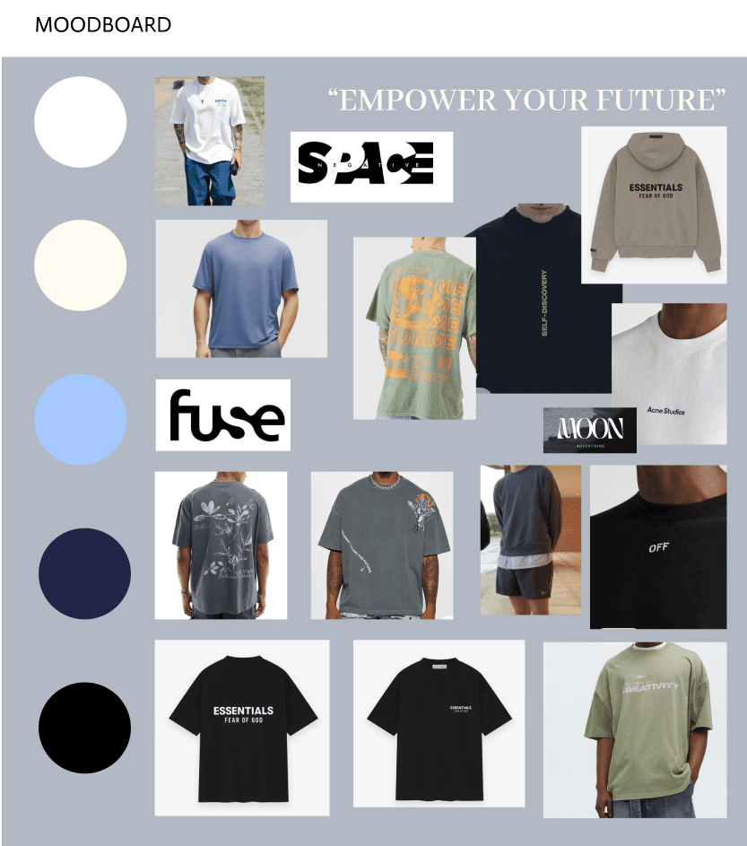 After creating this persona, I was able to understand what other brands they would wear, so I started to draw some inspiration on it. Below, you can see the mood board I created. I decided on this certain color pallet because I felt these colors were timeless and not overwhelming which played into my design ideas of wanting to make something simple yet sleek.