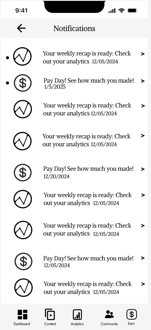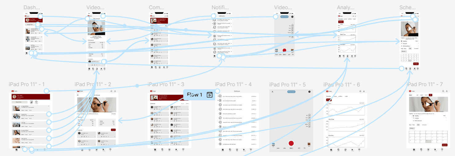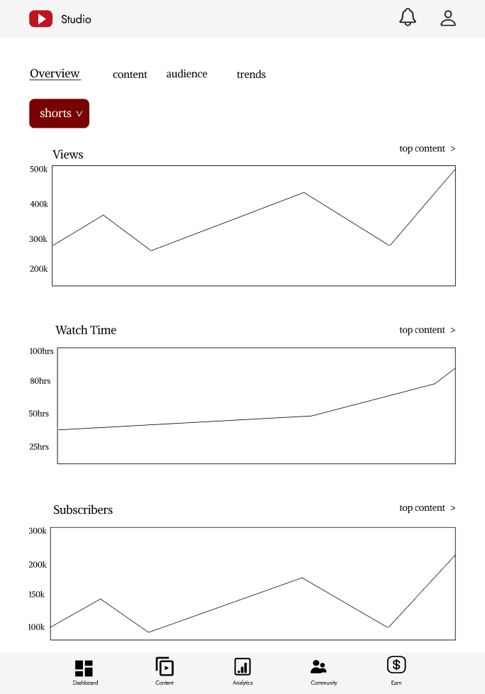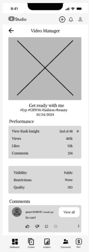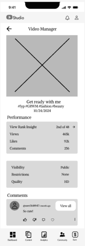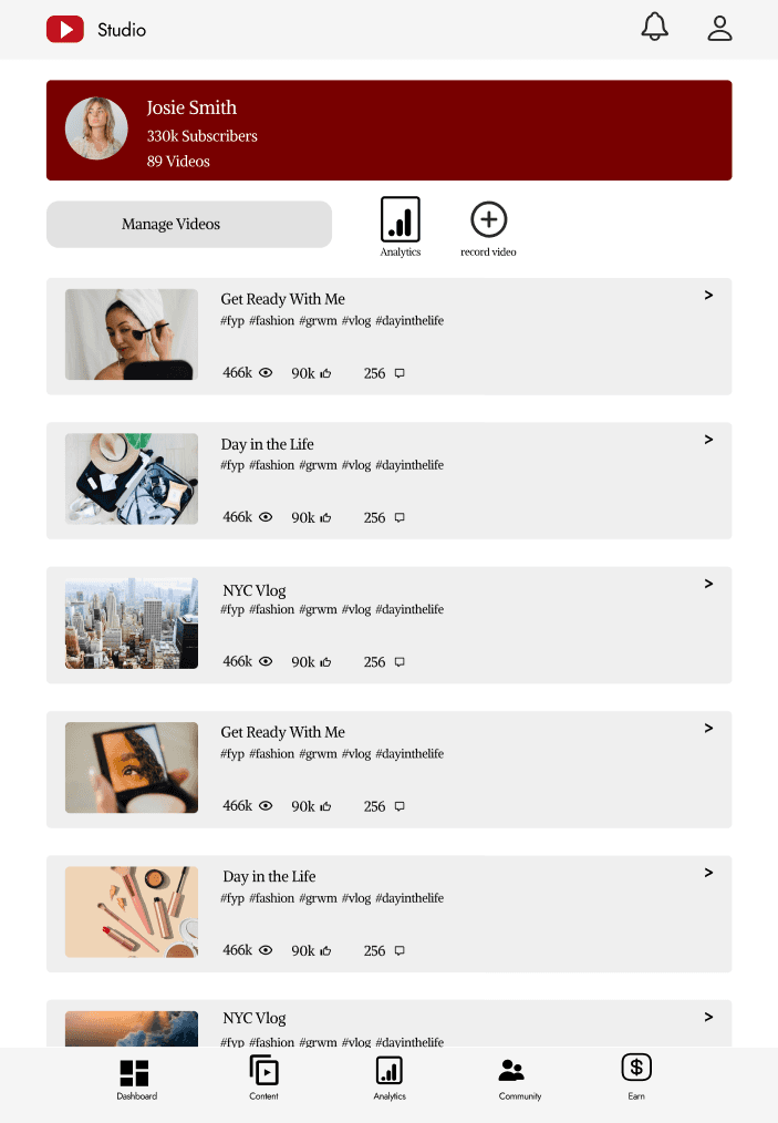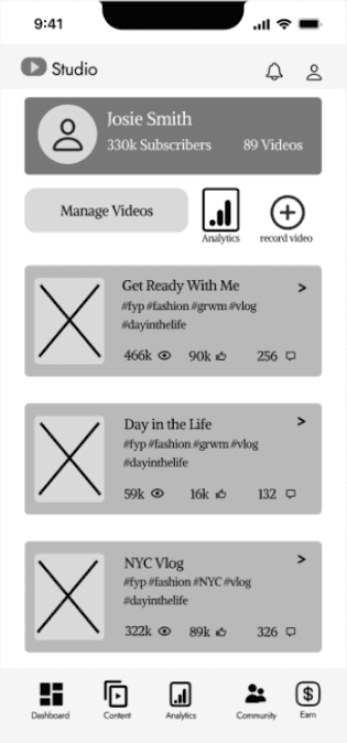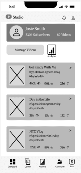 After creating my user persona, and conducting my user studies, I then made my wireframes. These wireframes were a rough layout of what the new app would look like. Something to note is, not all of the wireframes are completely different from the YouTube Studio App. Some things I felt I did not need to change based off of my user testing and I found what the user liked, and what they didn’t. Below are the wireframes.