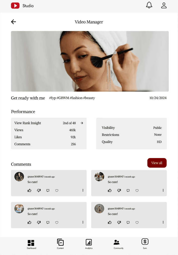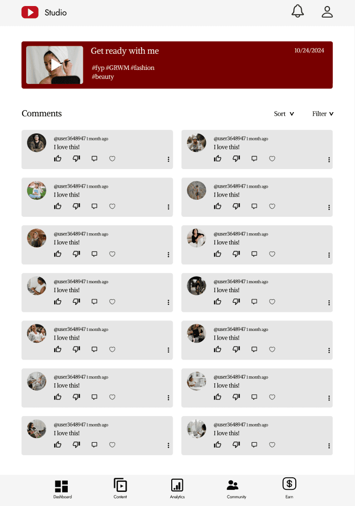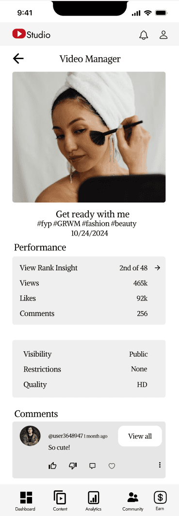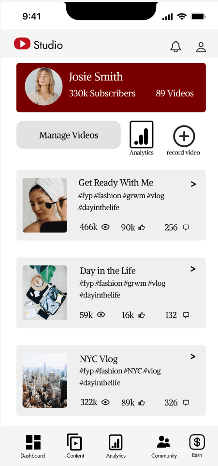 For one of my classes, I was tasked to redesign a mobile app of my choice, and create a mock app of what those improvements would look like if implemented. The app of my choice was YouTube Studio. Youtube Studio is an app for creators and influencers who post content on Youtube. The reason I chose this app was because I had past experience uploading content to YouTube through this mobile app. I had friends who similarly used the app on a regular basis to upload content as well, but they also struggled to locate certain features to make the app more user-friendly. I got started on the project and my goal was to create a visually engaging, user-center design that was both intuitive and functional for all users.