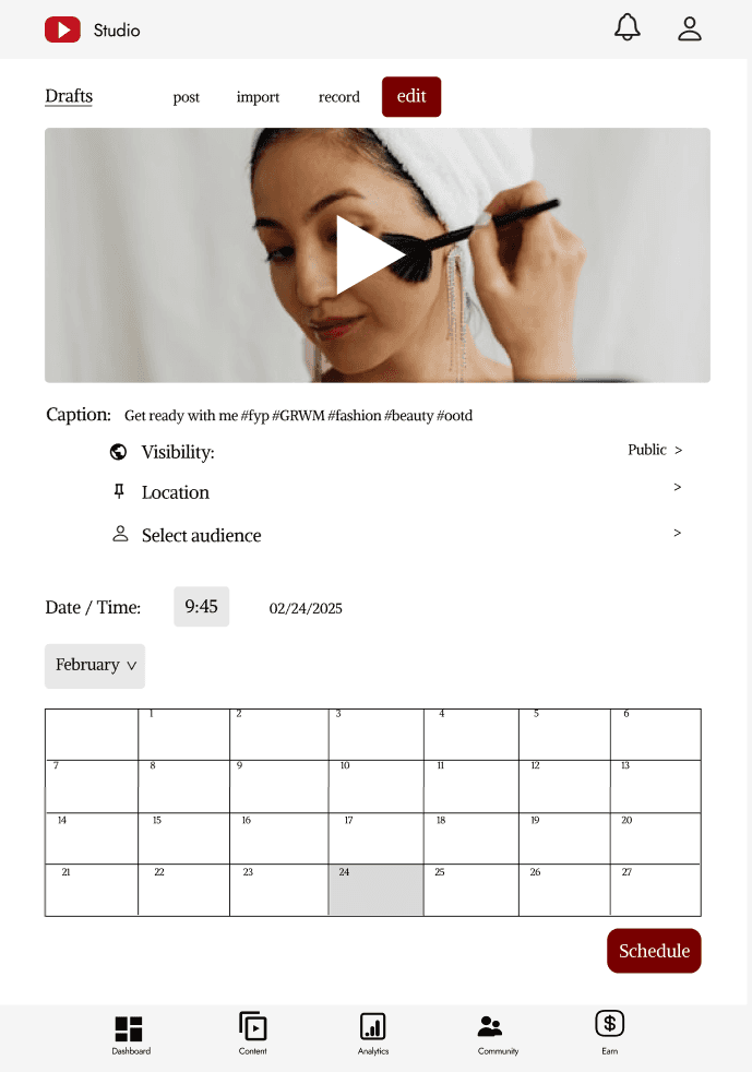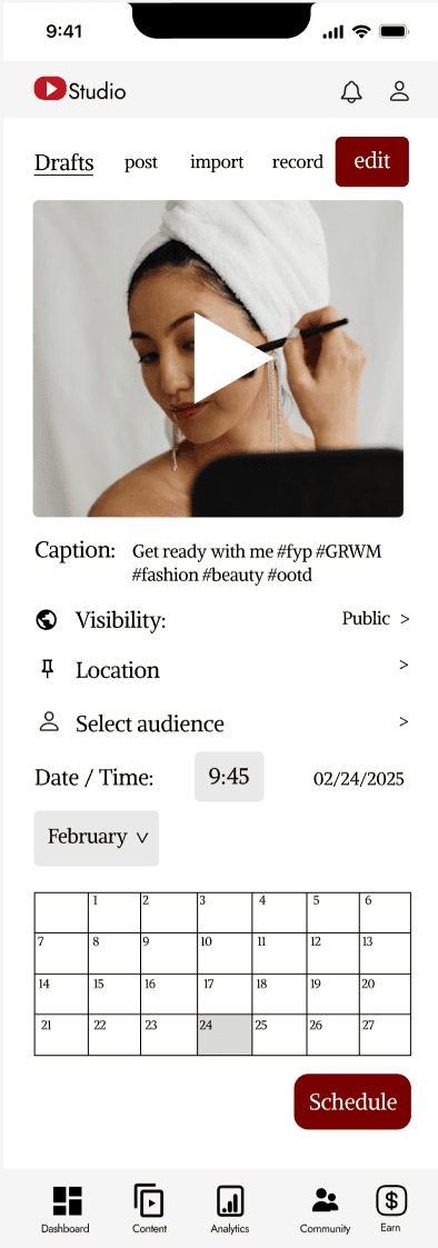 Redesigning the YouTube Studio App pushed me to think in new ways while challenging myself to fully understand where the user was coming from to make something more intuitive and user friendly. I was able to apply the full design process from user research to wireframing, surface comps, and prototyping. In the beginning, I was able to identify three major pain points that the users struggled with: editing videos within the YouTube Studio App, scheduling content, and understanding the analytics section. Through brainstorming and sketching out ideas, I was able to create something that I feel like is very intuitive for the user and allows for smooth navigation.